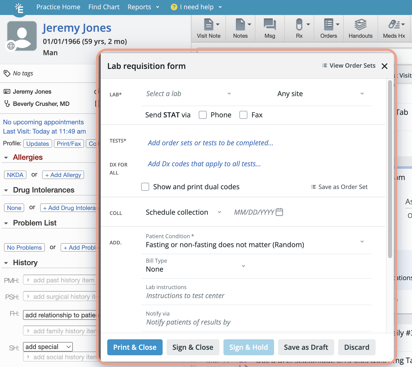 Save the lab order as a draft and close the lab order window. The lab order draft will remain in the Requiring Action section of the patient’s chart until it is signed or discarded.