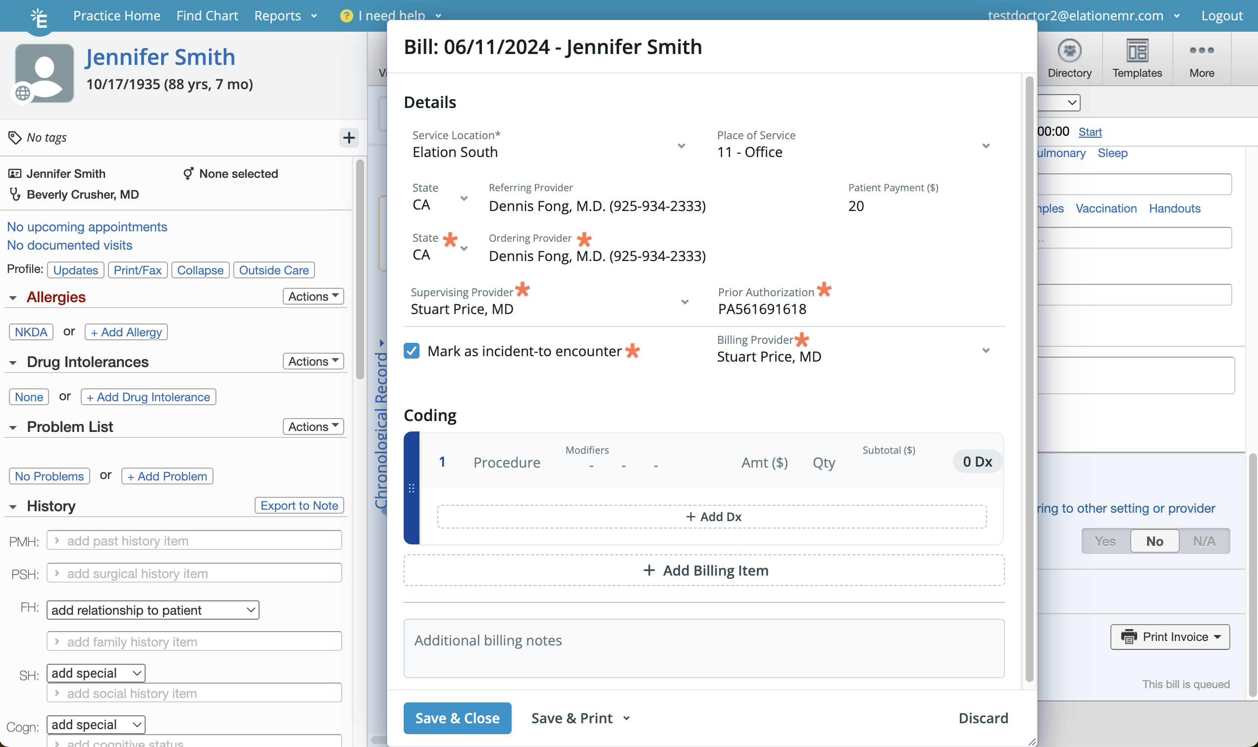 Elation strives to be the single place for all clinical information for your patients. You can use the Billing Form in the Visit Note to create a Super Bill for your patients. If you are using one of our integrated Practice Management System (PMS) partners, the claim will be automatically generated in the Practice Management System after you sign your visit note and you will not need to double document.