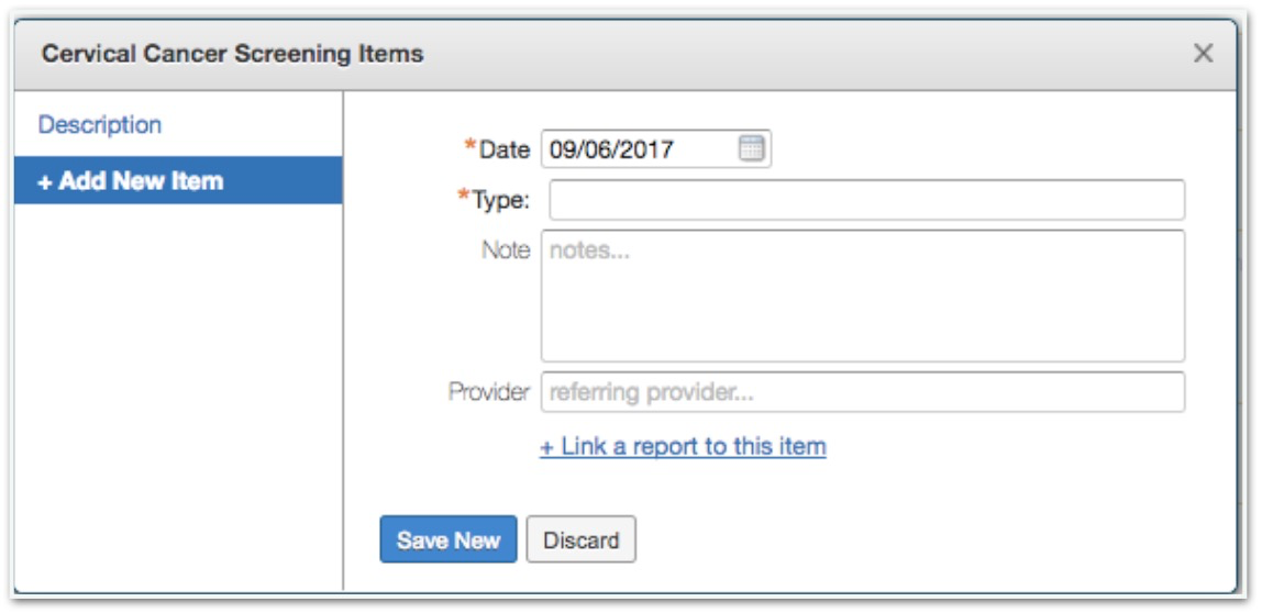 Go to the Health Maintenance section of the Clinical Profile and click on the name of the Health Maintenance item you wish to document.