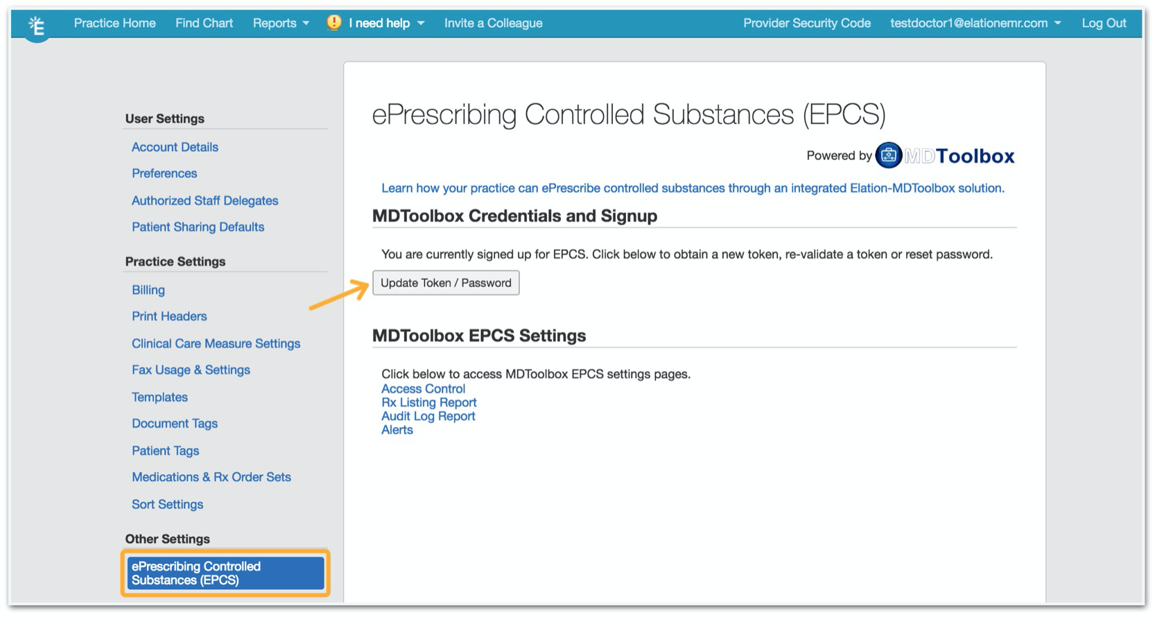 - Within the "ePrescribing Controlled Substance (EPCS)" page, click the "Update Token/Password" button.
