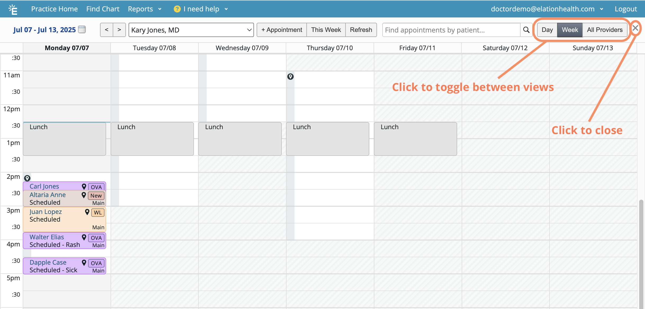 The Expanded View provides a more detailed look at the Calendar by day or week, and allows you to view multiple provider schedules side by side. Select All Providers to see all schedules at once for easier practice management. To return to the Standard View, click the X in the top-right corner.