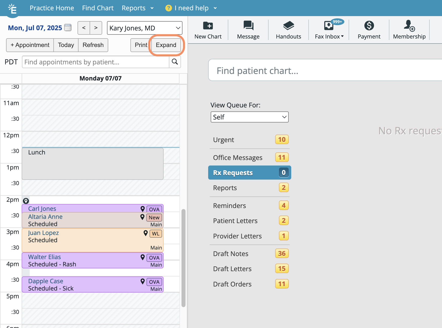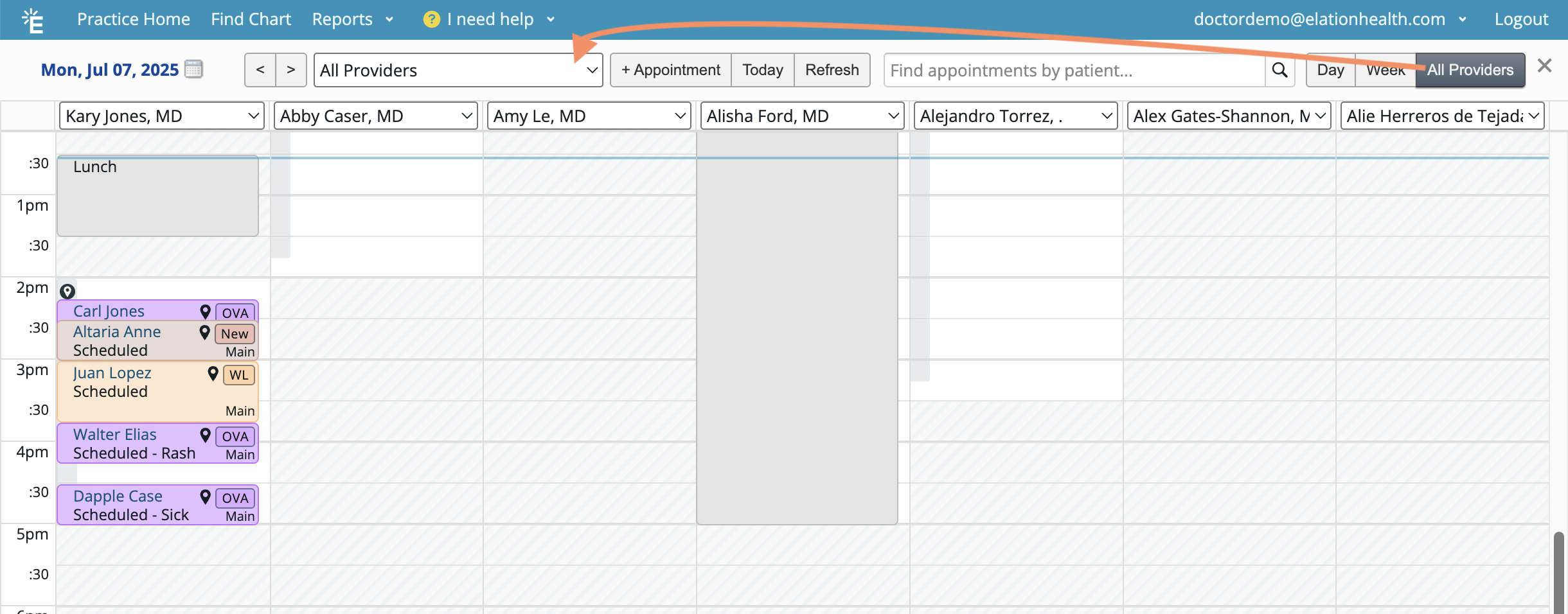 - Select which Provider's schedule you want to view by clicking on the Provider dropdown (for multi-provider practices).