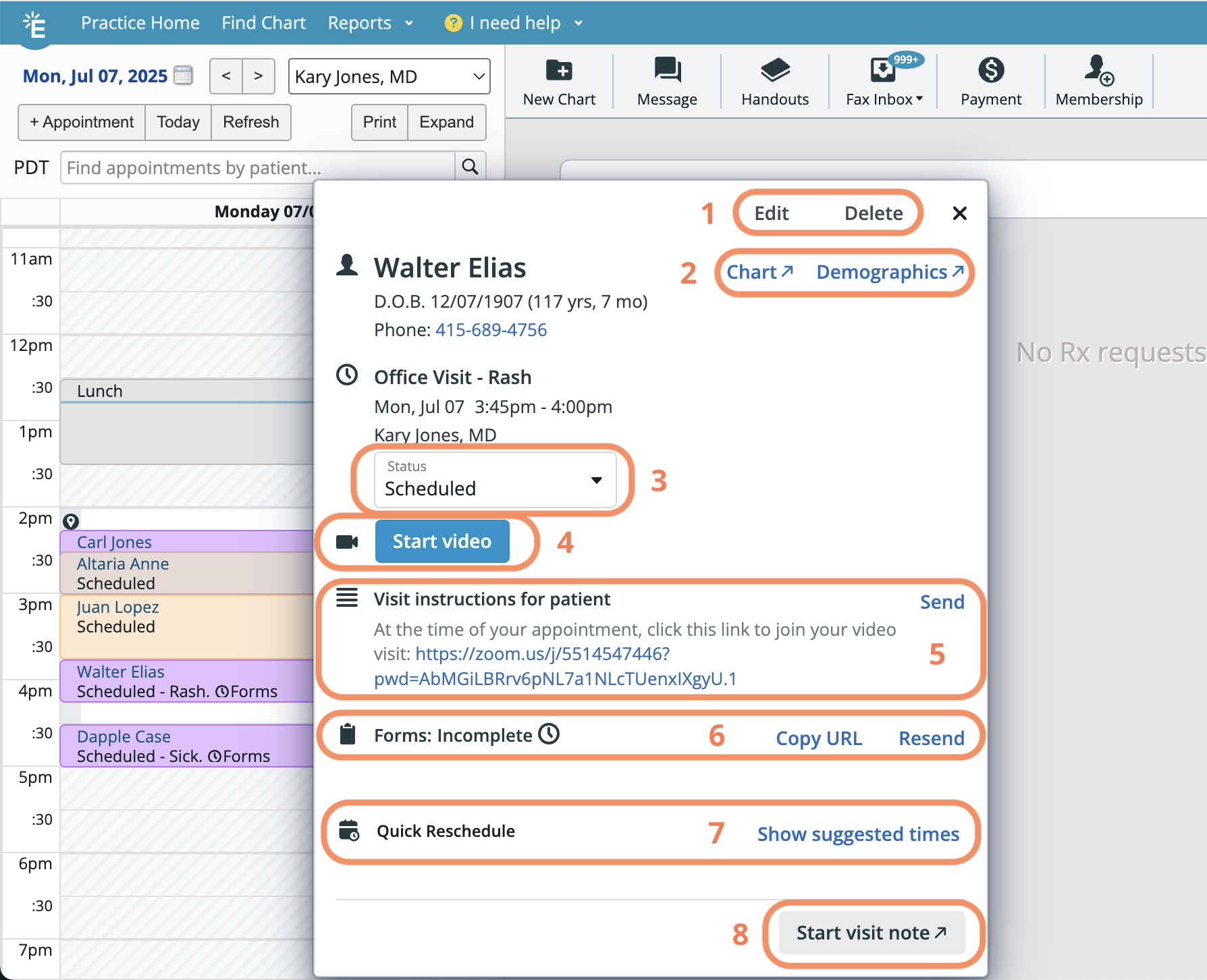 Start Visit Note button (8) appears only for appointments scheduled for today. Clicking this button triggers Visit Note Automation, which automatically populates the note with content based on the settings for the associated Appointment Type—such as Visit Note Categories and Visit Note Templates.