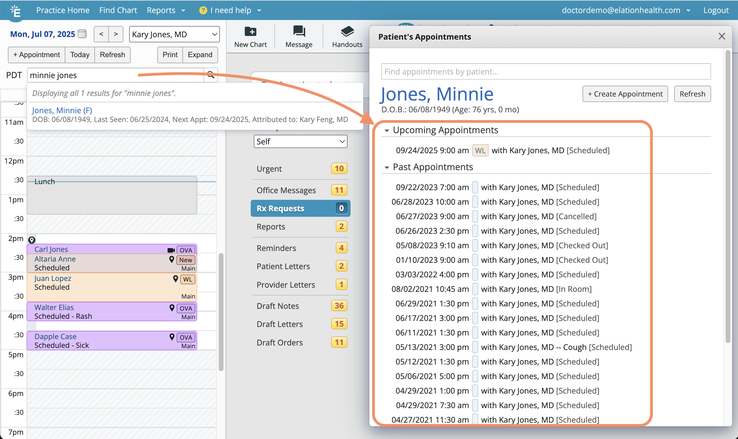 | 2 | Select the matching patient's name to view a list of all past and upcoming appointments. |