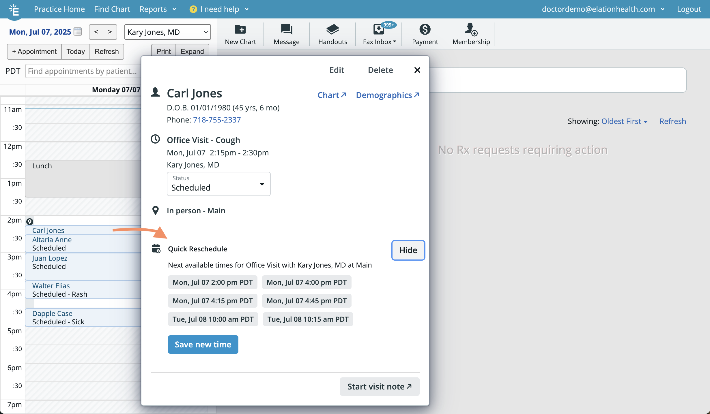 Quick Reschedule streamlines the process of moving appointments by letting you instantly select a new date and time for a patient visit—all without leaving your current workflow.