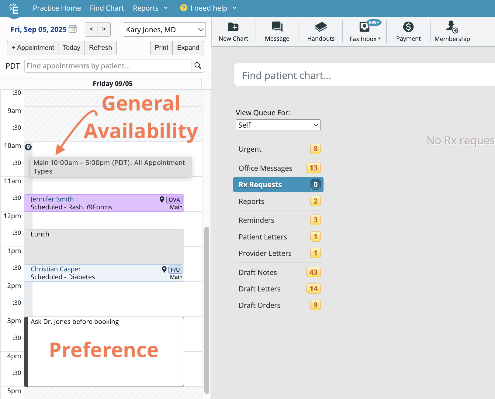 Dr. Jones is available from 10am to 5pm on Fridays for all appointments, but she would prefer the staff to book all of her appointments before 3pm when possible. This way she might be able to leave the office earlier on Fridays. Staff can create a Non-Blocking Calendar Event from 3pm to 5pm titled "Ask Dr. Jones before booking" to communicate this preference without blocking the time. karin